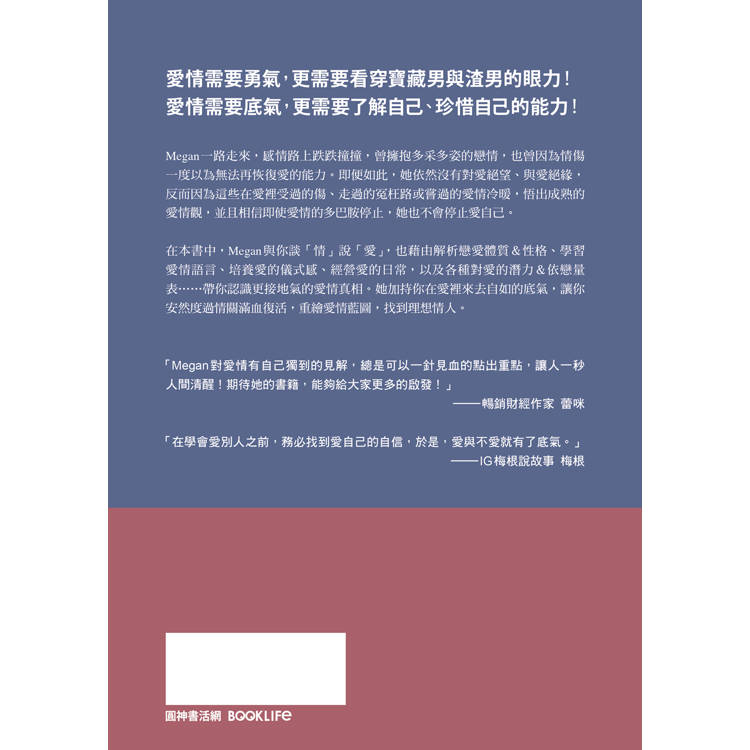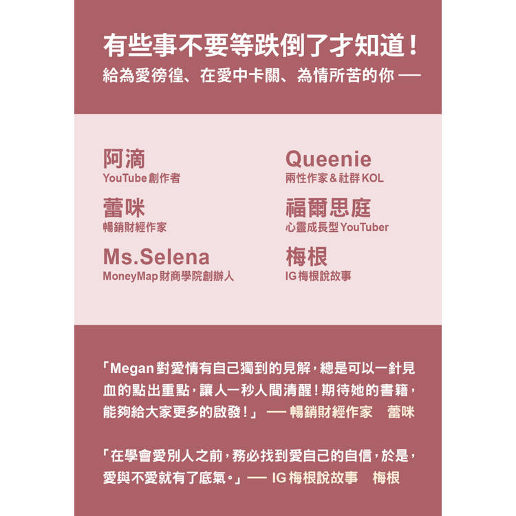 「Megan對愛情有自己獨到的見解,總是可以一針見血的點出重點,讓人一秒人間清醒!期待她的書籍,能夠給大家更多的啟發!」——暢銷財經作家 蕾咪