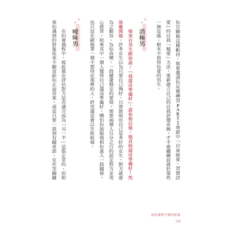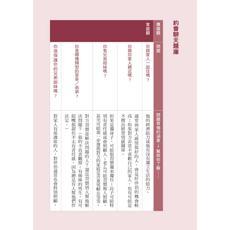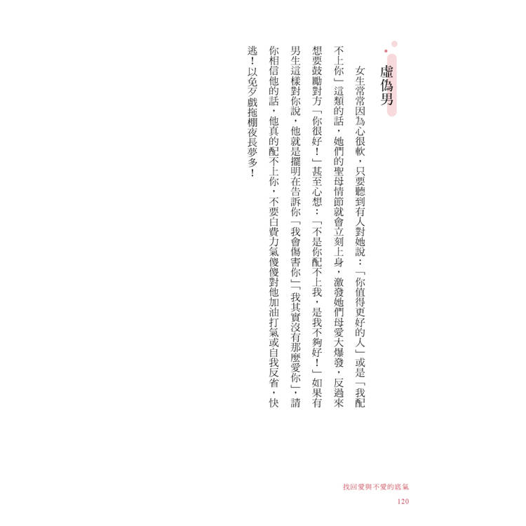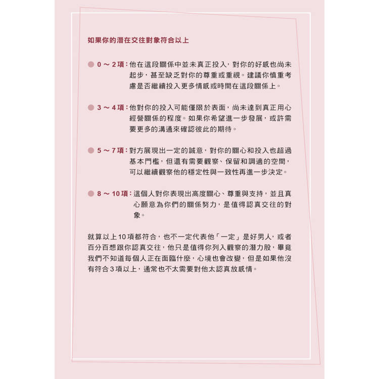 每個人的愛情價值觀會根據各自不同的成長背景、人生歷練、自我價值認同、創傷記憶等等天差地別,在我閱歷了眾多觀點,對於感情各個面向的認知也更寬廣,並且長期進修戀愛學分之後,終於歸納出我認為適合現代女性約會時的心態及行為。本書沒有正確與否,也絕對無法滿足所有人,只是分享適合我目前人生階段的戀愛方式。