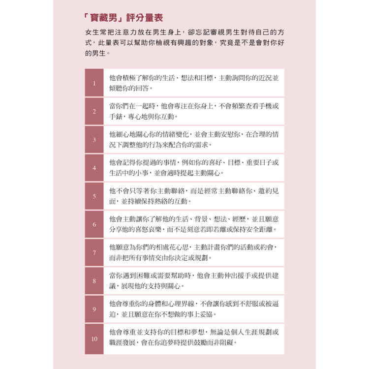 開發自己的戀愛魅力、避開感情誤區,到一眼辨識寶藏男、找到對的人,成為更好的自己!內容簡介