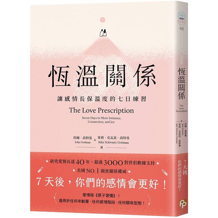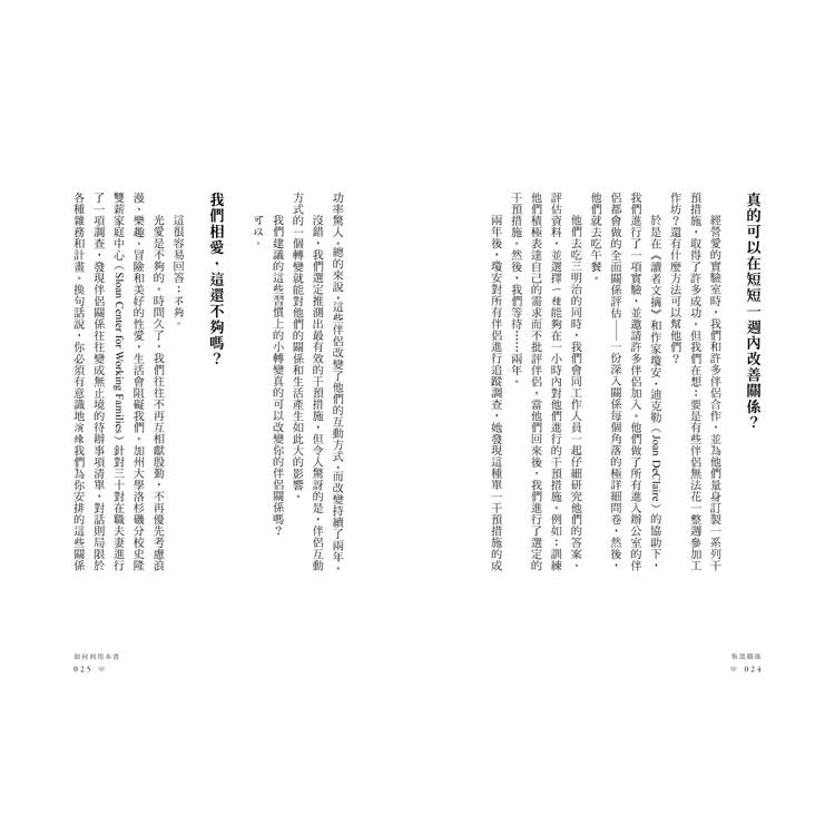 「你以為你不能在一週內改善關係?約翰和茱莉.高特曼博士說,是的,事實上你可以——他們以四十年在婚姻穩定性和離婚預測方面的突破性研究來證明這點……本書讓人感覺充滿希望,因為它很直接、真誠,而且非常可行。」——布芮尼.布朗(Brene Brown)