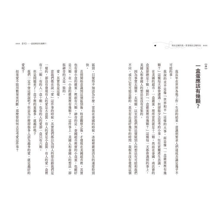 褚士瑩以獨特的角度切入,梳理不同人對於愛的認知與期待。有人的愛是大盒裝,有人的是小盒裝,有人習慣盒子裡放十二顆蛋,有的人認為十顆剛剛好,也有人只要六顆。