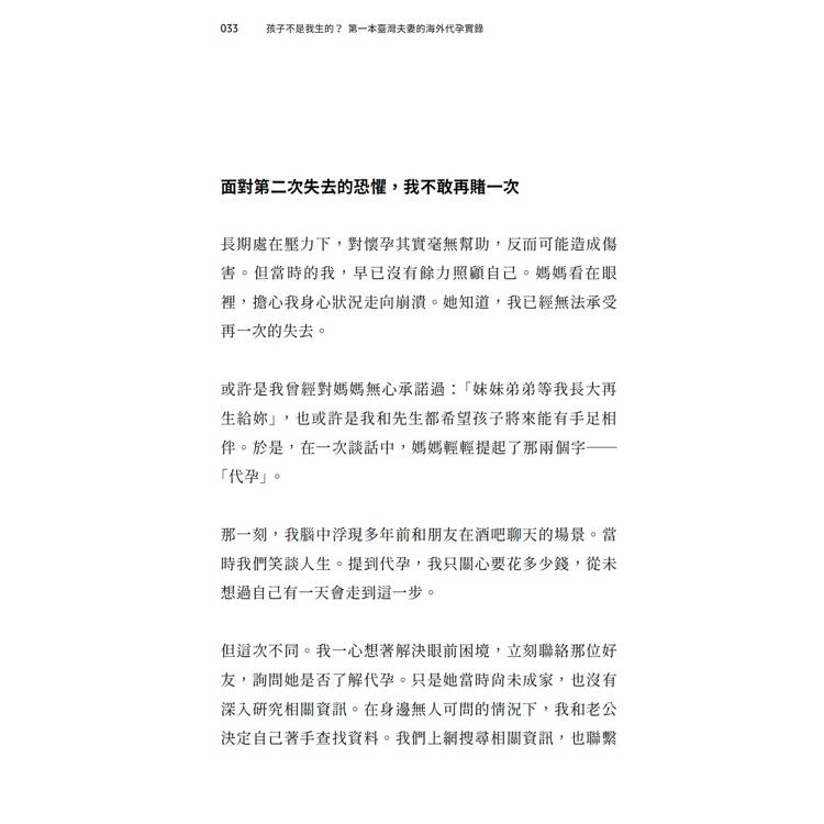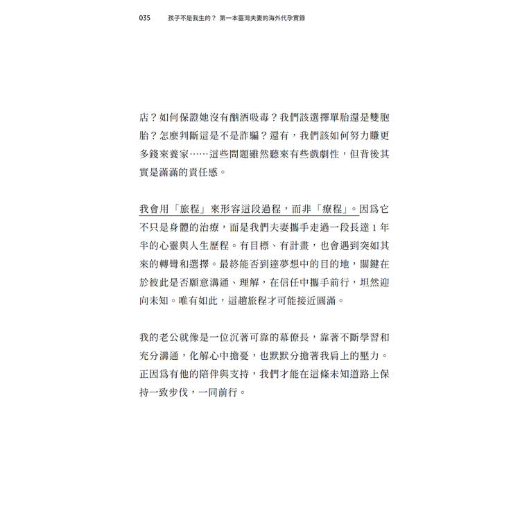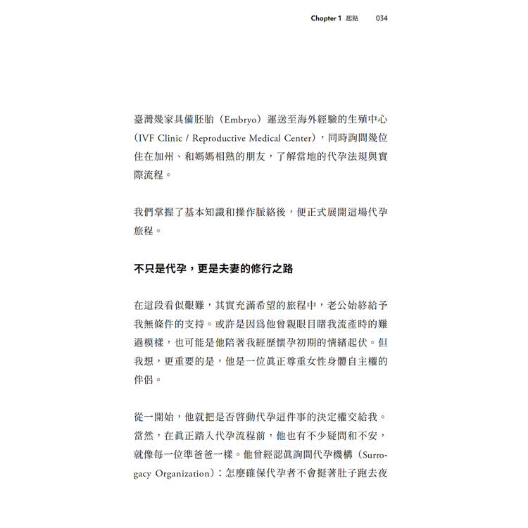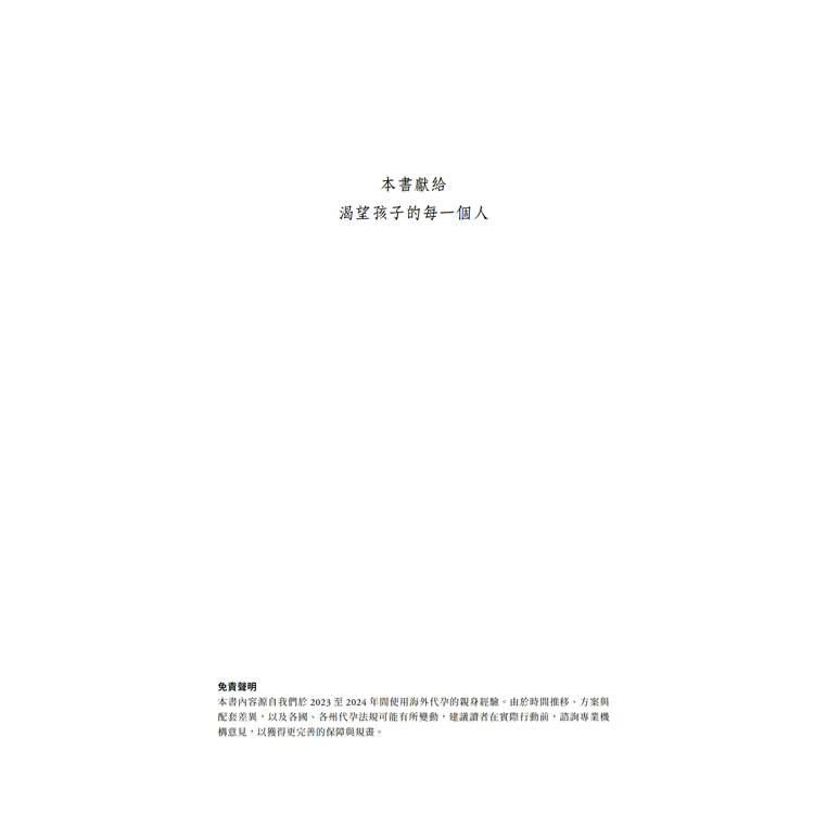 本書不僅是我和我先生的經歷紀錄,也希望幫助有相似經歷的家庭和個人,提供你們在這條路上可能遇到的問題與解決思路。更重要的是,希望這個社會更理解並認同代孕參與者,讓這條路不再充滿質疑與偏見,而是成為眞正有需要的人所能依靠的光明之路。