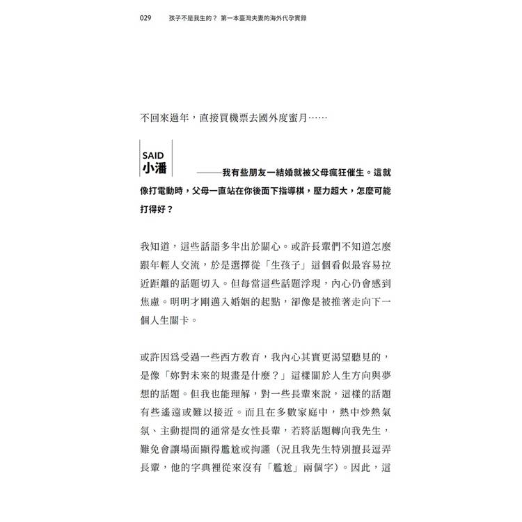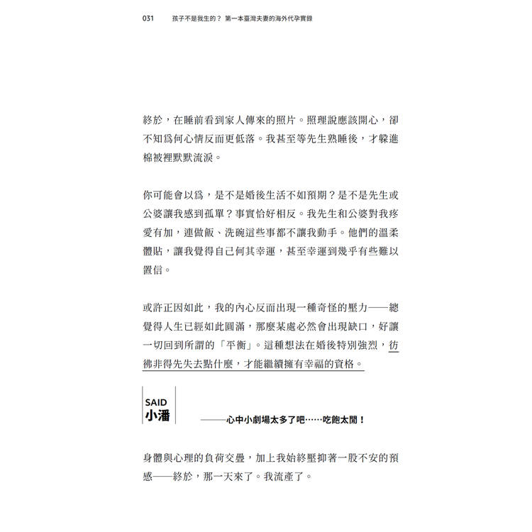|小潘∣────── 我原本想自己扛下一切壓力,打算跟所有人說我小時候騎腳踏車撞破睪丸,讓他們別再催促我們生小孩,但一直找不到時機說,後來就走上代孕這條路了。