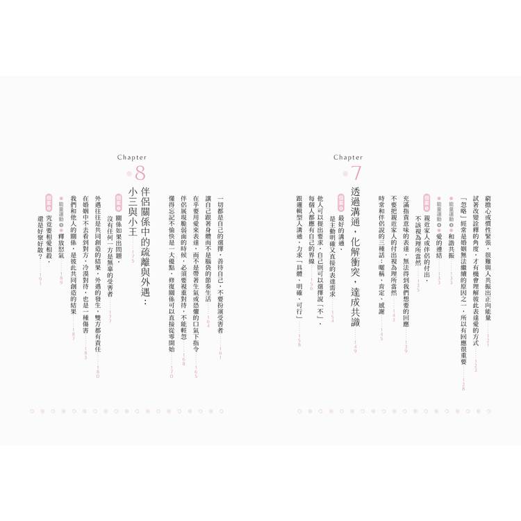 不少有關婚姻關係的研究發現,婚姻失敗的最重要元素不是吵架或衝突,而是情感需求未能得到滿足,所以有些人只好向外尋求搞外遇,或是對伴侶充滿怨懟,搞得自己像是婚內失戀一樣傷心痛苦。伴侶若能學會滿足彼此的情感需求,除了可以讓關係愈來愈穩定,也會讓人感到幸福美滿,所以本書在這方面多所著墨,希望幫助更多的伴侶甚至怨偶,能夠有機會感情回溫,進而變成愛侶,這也是我們撰寫本書的初衷。
