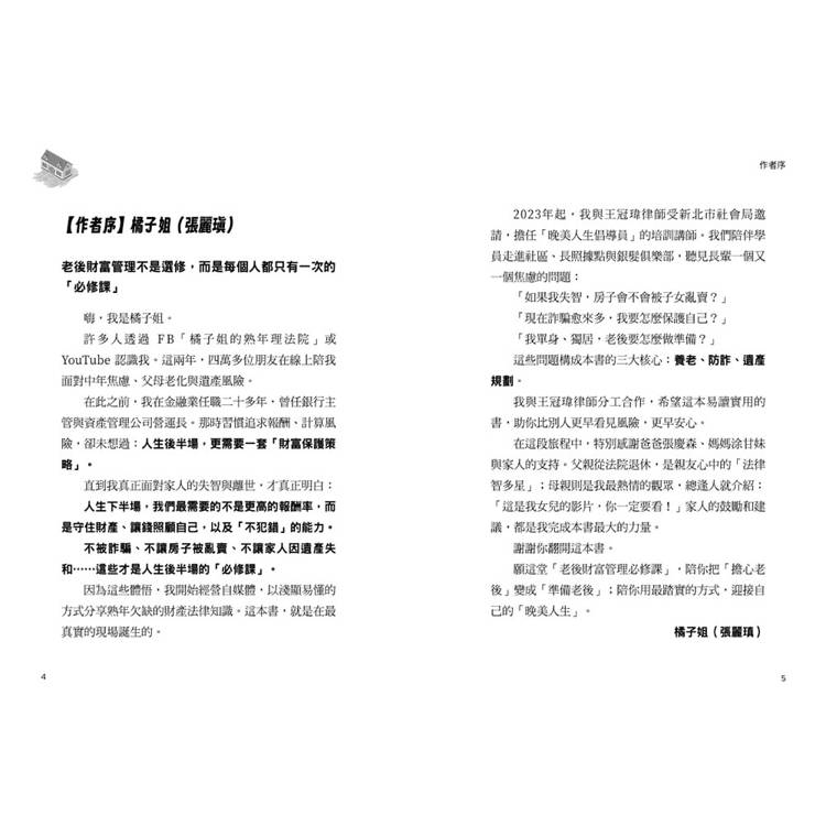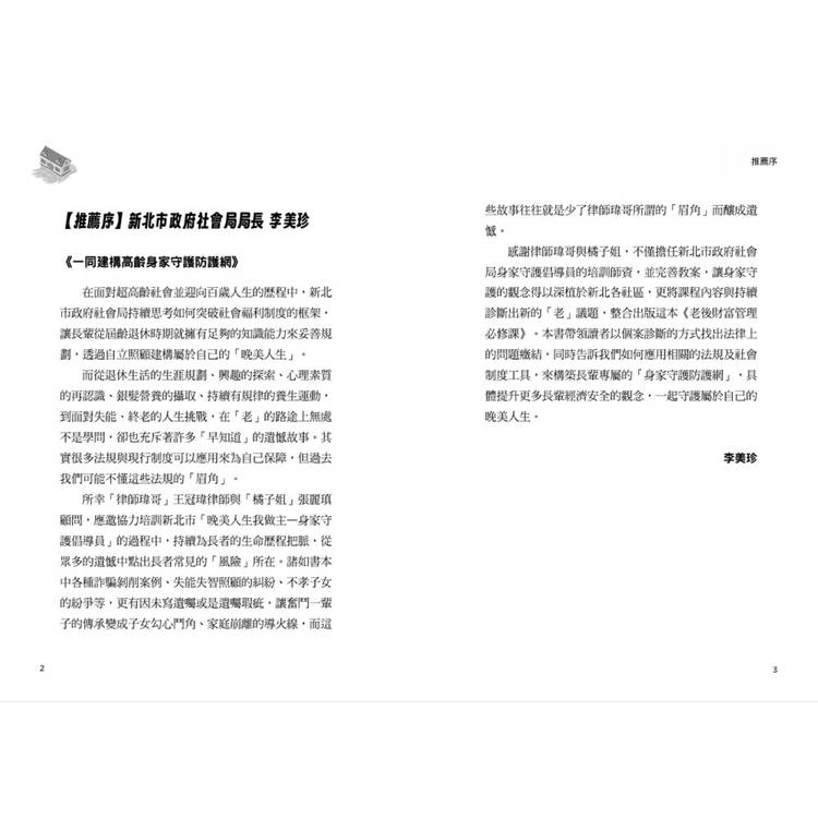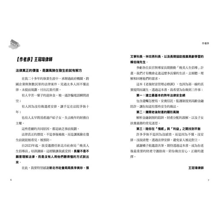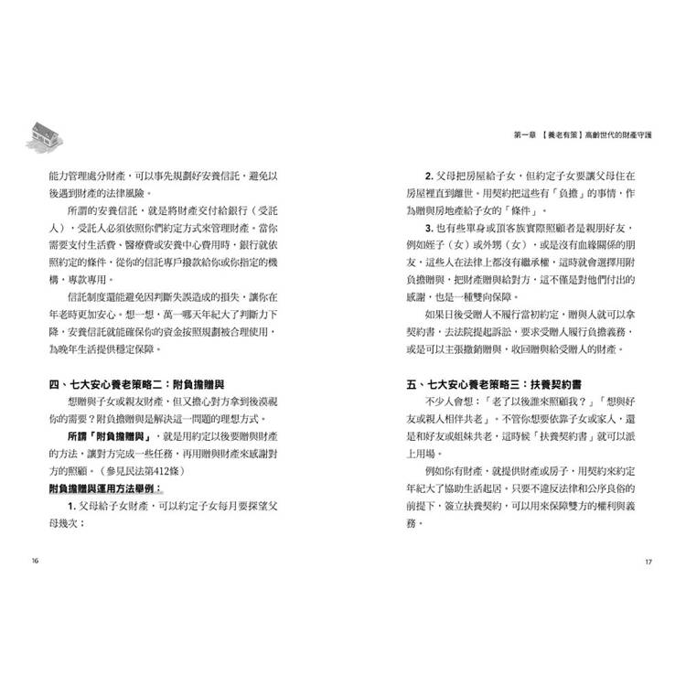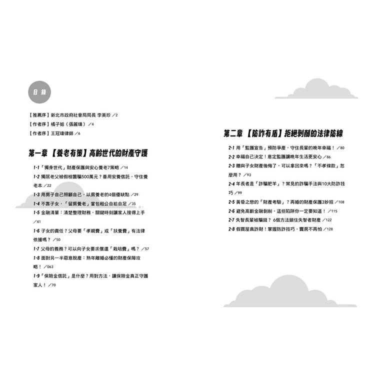本書共分為四大篇章,從養老規畫、防剝削、傳承到遺囑,完整拆解熟齡族最重要的財務安全問題。