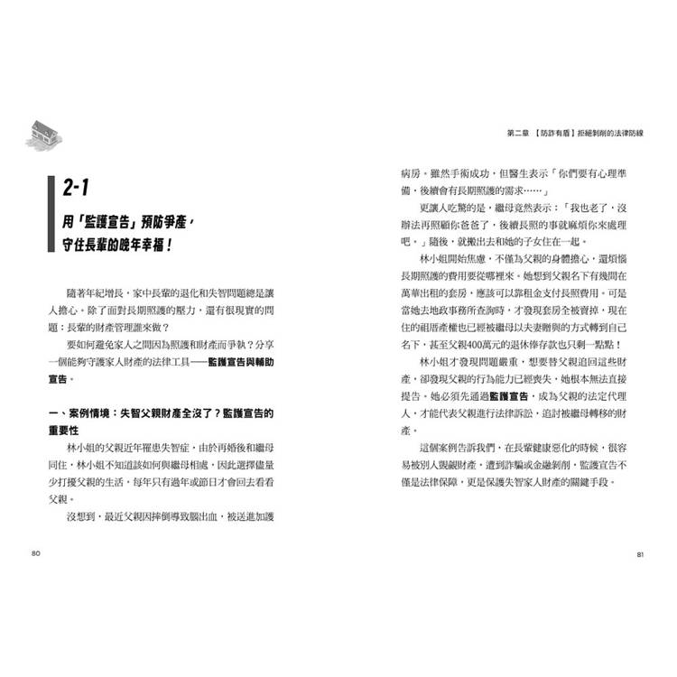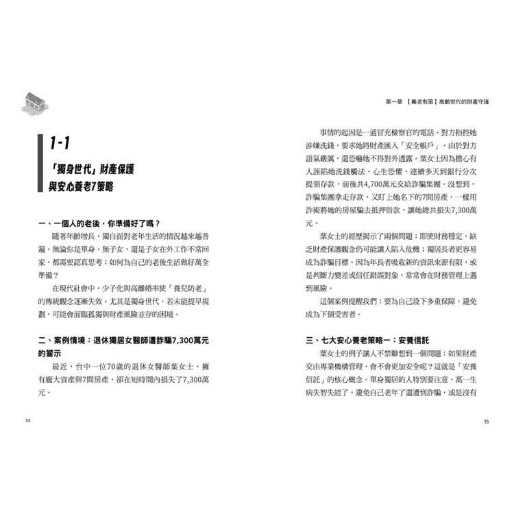 提供具體防護策略與工具:高齡防詐技巧、失智財產保護方法,以及安養信託、保險金信託、意定監護、金融清單等,幫助讀者搭建後半生法律防護網。