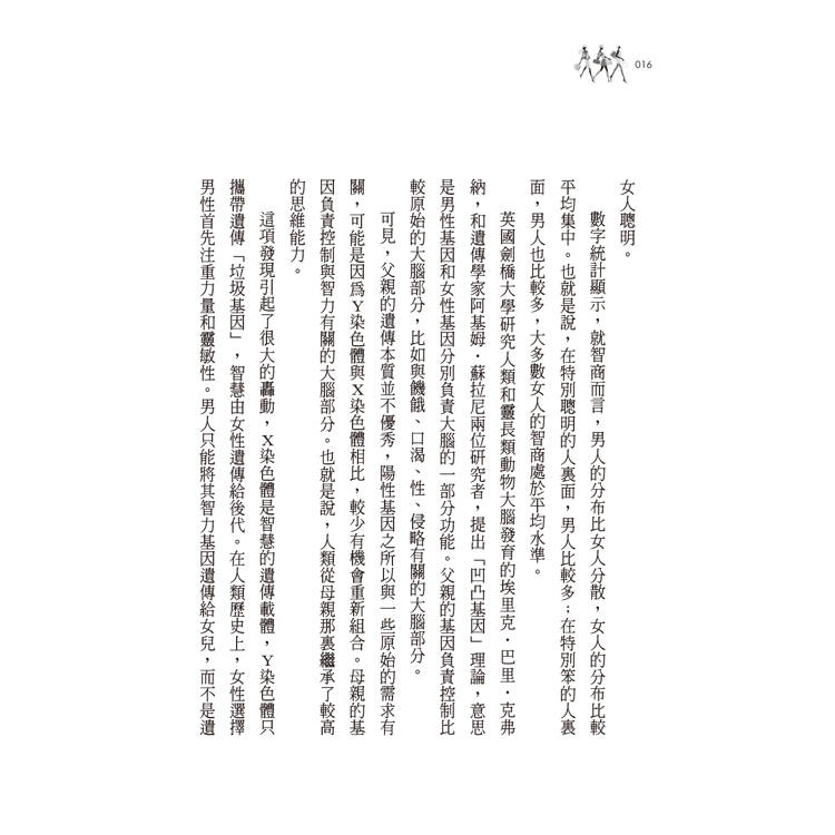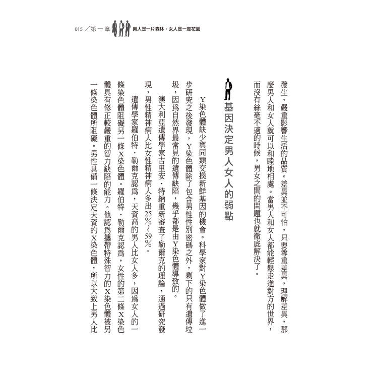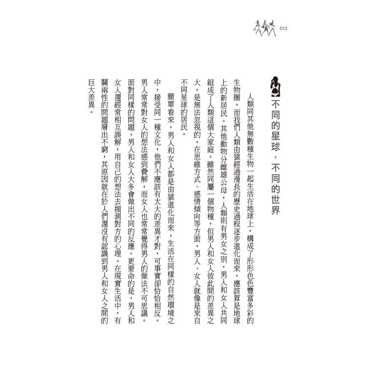 人類同其他無數種生物一起生活在地球上,構成了形形色色豐富多彩的生物圈。而我們人類由猿經過漫長的歷史過程逐步進化而來,應該算是地球上的新居民。其他動物分雌雄公母,人類則有男女之別,男人和女人共同組成了人類這個大家庭。雖然同屬一個物種,但男人和女人彼此間的差異之大,是無法忽視的,在思維方式、感情傾向等方面,男人、女人就像是來自不同星球的居民。