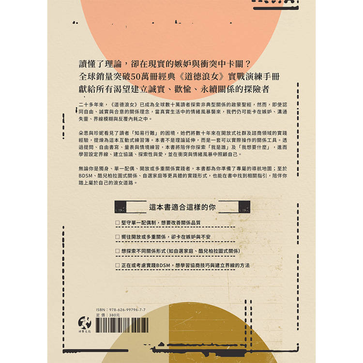 二十多年來,《道德浪女》已成為全球數十萬讀者探索非典型關係的啟蒙聖經,然而,即使認同自由、誠實與合意的關係理念,當真實生活中的情緒風暴襲來,我們仍可能卡在嫉妒、溝通失靈、界線模糊與反覆內耗之中。