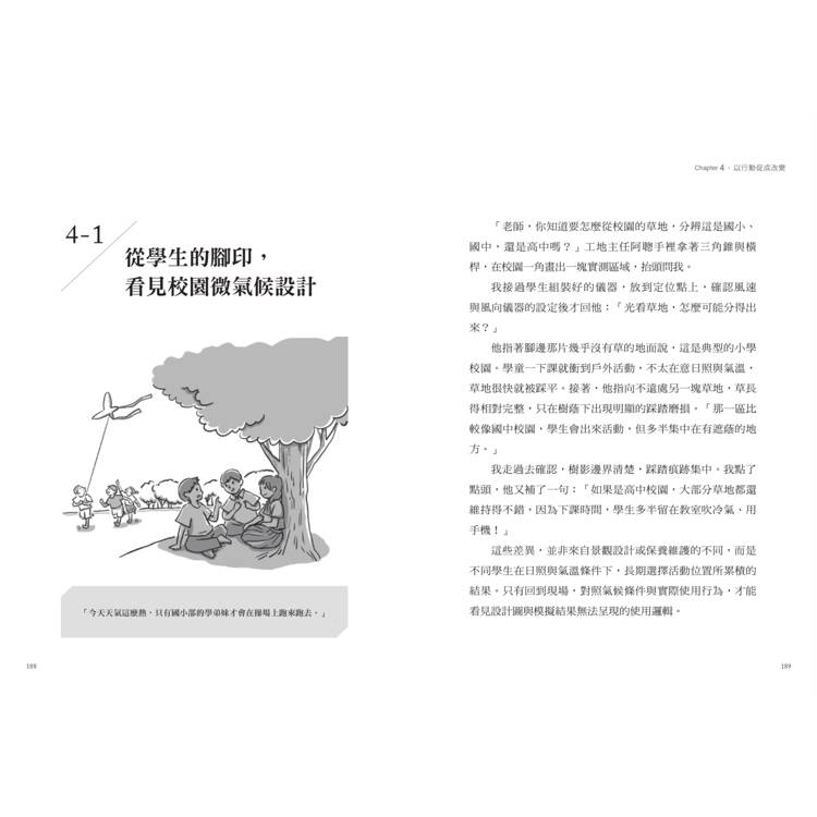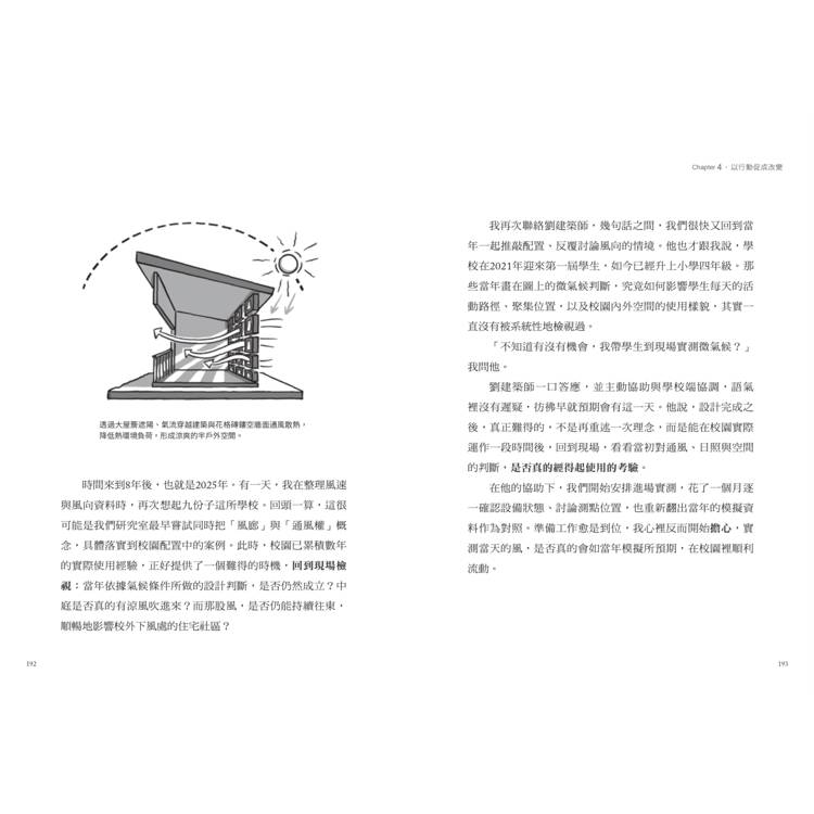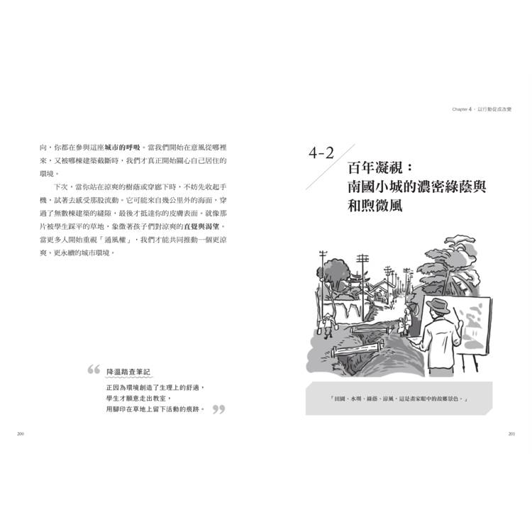 這本書除了文字,也透過插畫,協助你理解那些不容易只靠語言說清楚的現象:風如何流動,熱怎麼累積,遮蔭又如何改變體感。這些圖像不是裝飾,而是另一種理解的方式。
