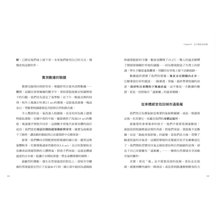 從街道遮蔭的連續性、基地通風率的入法,到校園微氣候的實際觀測,這本書記錄了科學如何走下學術殿堂,進入政府會議室,最後落實在學生的足跡與老人的日常中。我也期待在政策上能夠呼應科學界的觀點,能落實落地到保護國人的具體措施。