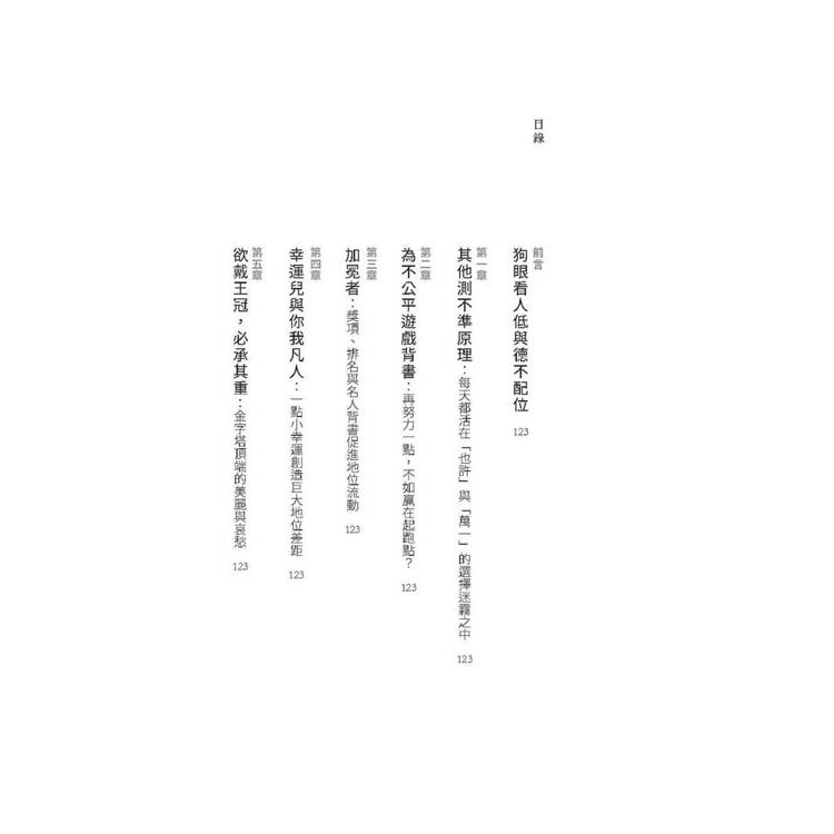 排名、獎項、頭銜、名人推薦,一再影響著我們生活的方方面面:從健康、人際關係、職涯發展,到我們在社交場合的舉止,以及我們所培養的品味與偏好。沒有它,我們將迷失在無數選擇之中。但代價也極其沉重:即便成就的本身毫無優劣差異,聲望高者在絕大多數的人們眼中就是會比聲望低者來得更為亮眼。全球數位化更助長了此一現象,最後造就了社會地位主宰一切,贏家全拿的世界。