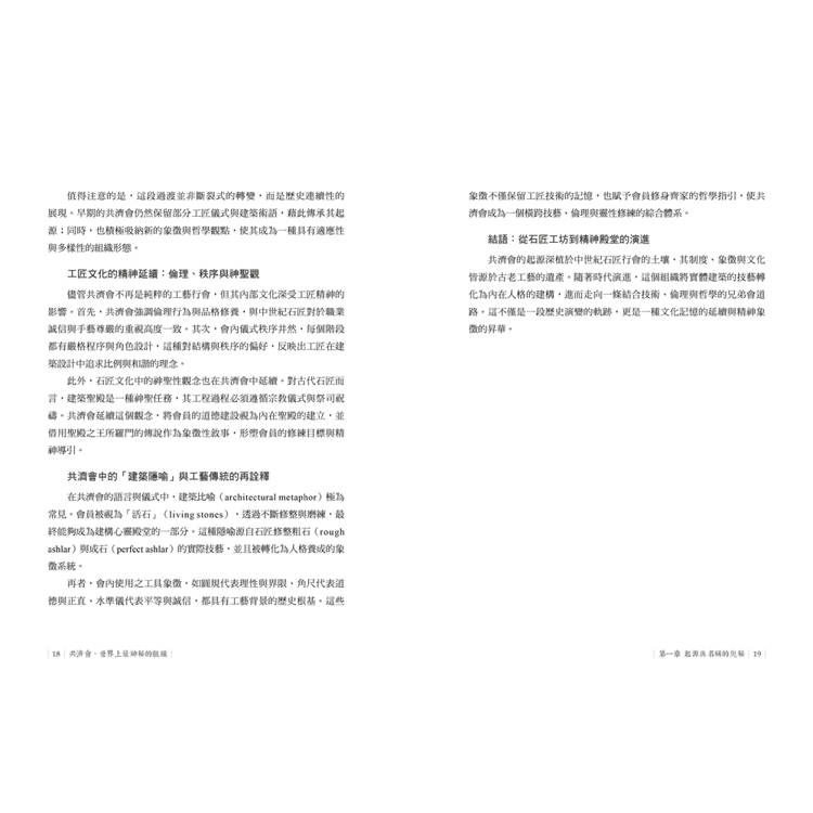 共濟會的起源深植於中世紀石匠行會的土壤,其制度、象徵與文化皆源於古老工藝的遺產。隨著時代演進,這個組織將實體建築的技藝轉化為內在人格的建構,進而走向一條結合技術、倫理與哲學的兄弟會道路。這不僅是一段歷史演變的軌跡,更是一種文化記憶的延續與精神象徵的昇華。