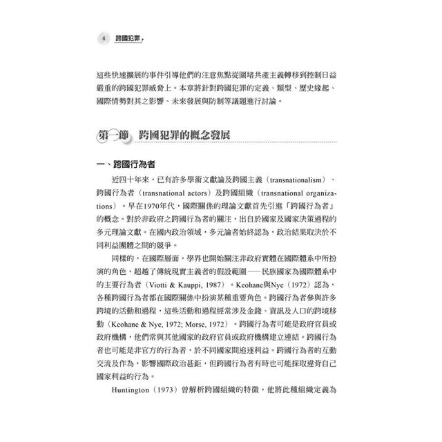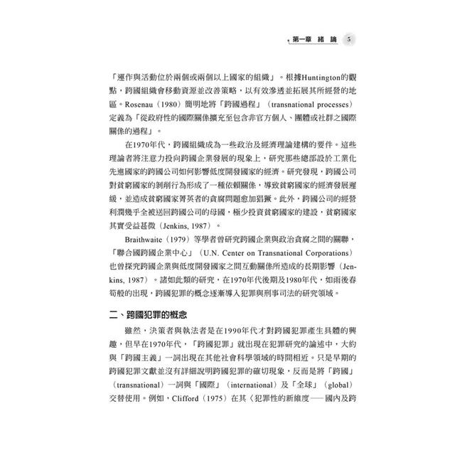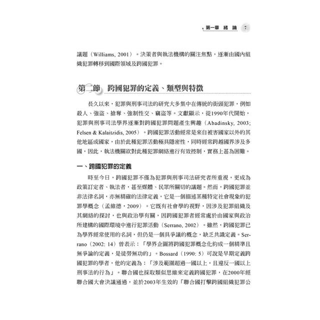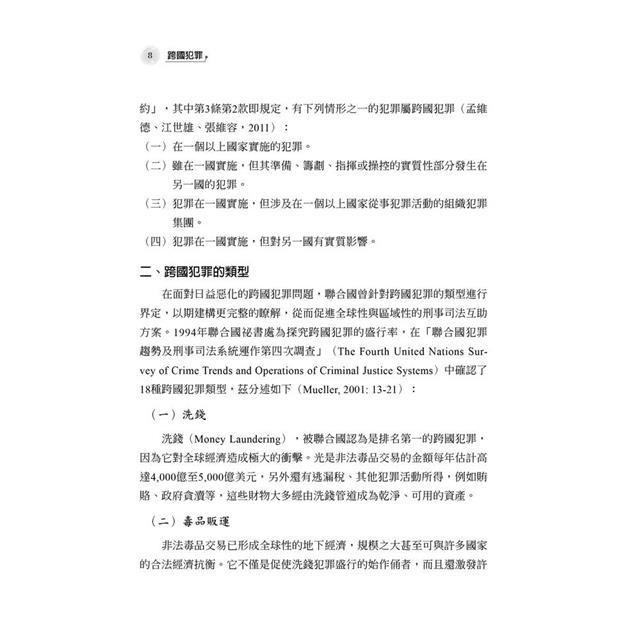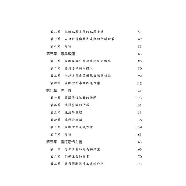 全書共計17章,詳細探討了跨國犯罪的類型、國際執法合作組織及跨國犯罪防制措施,可說是一本與國際警察合作、國境執法、移民政策分析、國土安全與國境安全管理等領域有關的專論。本書能夠順利完成,需要感謝許多人的協助與鼓勵。首先,感謝中央警察大學提供優良的教學與研究環境,賦予筆者所需要的研究靈感與能量。撰寫本書期間,筆者曾多次前往刑事司法機關蒐集資料,承蒙相關人員的協助,研究才得以順利進行。此外,若無行政院科技部提供的研究補助,筆者勢必無法執行較大規模的系統研究,研究所得難以成書,在此一併表達誠摯謝意。當然,如果沒有五南圖書出版公司的支持與協助,本書必然無法順利出版,筆者同樣心存感激。