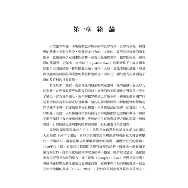 犯罪學者及刑事司法實務人士對於發生在自己周遭環境以外的犯罪,通常較感陌生,也較缺乏興趣。長久以來,暴力及竊盜犯罪一直都是學界和實務界關注的犯罪問題,理由是這些犯罪經常發生在你我的生活周遭,感覺很近,也較熟悉。然而,在全球化浪潮與科技精進的影響下,空間和時間被壓縮,不僅把世界變小了,也改變了促使犯罪發生的機會結構。近年來,有一種犯罪已悄然滲透到我們的社會,那就是「跨國犯罪」。