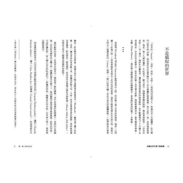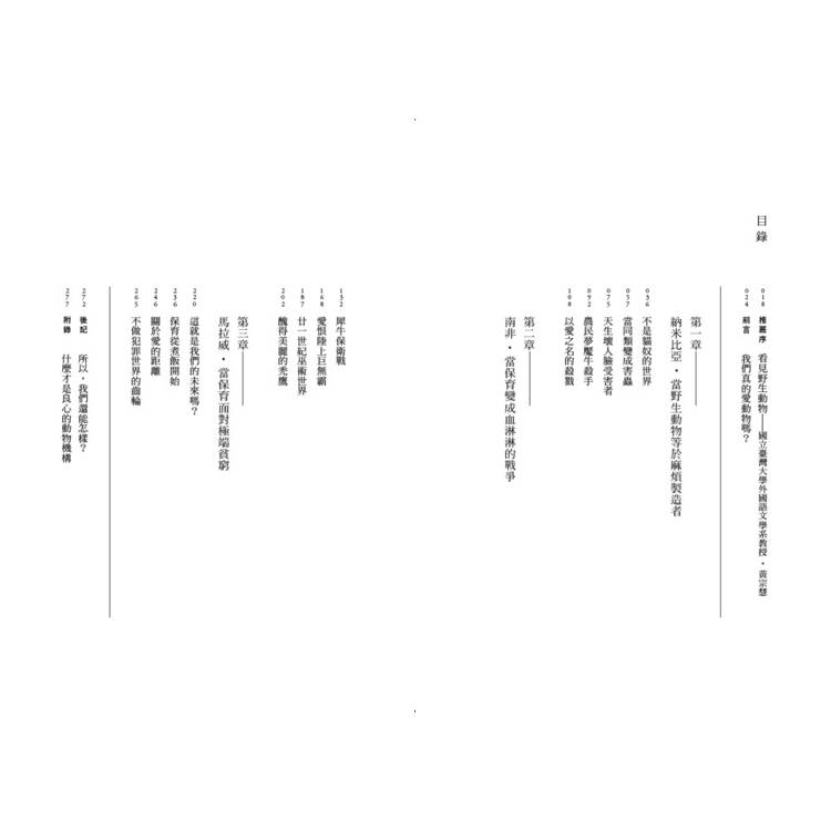 但急切的呼籲與嚴肅的主題卻絲毫不減本書的可讀性,因為遊走世界各地、旅遊記者出身的上田莉棋,是透過第一手的動物志工經驗來傳遞保育工作的重要性。她親自到非洲去感受野生動物真實的存在、去面對保育實務的艱難,但她不說教,更不意在「示範」正確的保育之道,而是透過沿途的見聞與體驗,讓我們看到致力保育的人、生計受野生動物威脅的人、盜獵的人、在遠處貪婪或無知地消費野生動物的人……這種種人的不同面貌,以及他們的選擇與作為如何牽動了動物的處境;而即使同樣是有志保育的人,也有形形色色的不同,甚至彼此間的立場和價值觀都可能是衝突的,於是一篇篇有人、有動物、有感傷悲憤、也有溫馨畫面的故事,就在讀者眼前陸續展開,帶我們追隨著她的腳步、她文字的鏡頭,進入她所形容的,「有很多很多愛的書」。