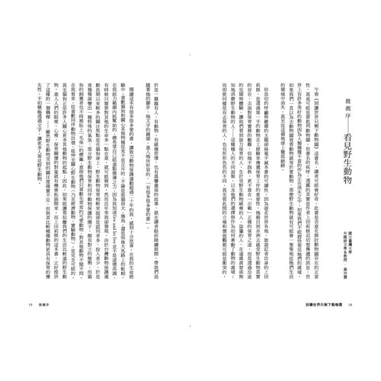 閱讀這本有很多很多愛的書,讓致力動物保護運動超過二十年的我,感到十分欣喜。在我的生命經驗中,喜歡貓狗和關心其他物種從來不是互斥的,不論是街貓浪犬,傷鳥,還是雨後大馬路上的蚯蚓,在我能力範圍內能幫助的,總希望自己能盡點微薄之力,因為我知道live and let live並不是道德高調,有時候只需要對其他的生命多一點在意,就可能做到。然而近年來我卻發現,由於台灣動物保護運動長期以來較多的關注焦點是在貓狗身上,野生動物保育相較來說卻是認同者多、投入者少,於是竟慢慢演變出一種特殊的氣氛:部分野生動物保育和同伴動物保護的圈子,頗有對立的態勢,而貓狗的飼養者也不時被貼上「毛保」的標籤,意指他們只喜歡毛茸茸的可愛動物,對其他動物不聞不問。在我看來,從喜歡同伴動物出發,延伸至關心野生動物(乃至經濟動物、實驗動物),是完全可能的,甚至貓狗正是許多人關心更多其他動物的起點;因此,如果能讓看似離我們的生活比較遠的野生動物,進入人們的眼裡、心裡,保育關懷的對象就有機會拓展開來。而上田莉棋的這本書,正好提供了這樣的一個橋樑——雖然野生動物受到的關注度確實不足,但與其比較哪種動物更具有保育的優先性,不如積極透過文字,讓更多人看見野生動物。