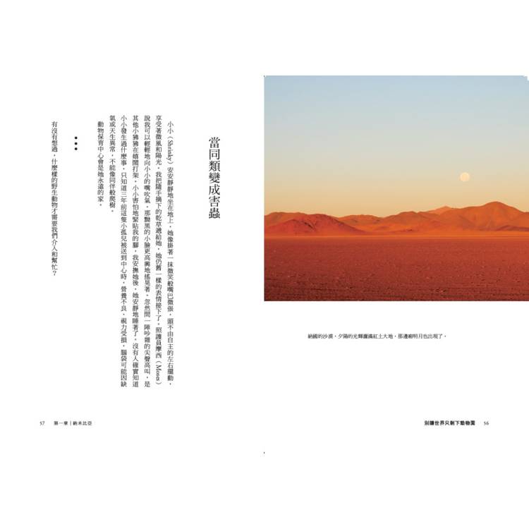 當然,看見野生動物,必然意味著可能看見牠們的不得其所、無路可逃,也因此有很多很多愛,有時也就會感受到很多很多的痛:「南非有八種禿鷹,原來四種已達極危、一種瀕危了,有專家估計其中至少兩種在十到二十年內就會絕種」「全非洲每年約有兩萬隻大象被盜獵、二○一九年一次充公的穿山甲鱗片達三十噸,IUCN估計每年盜獵量高達十萬隻」;犀牛的盜獵數量更驚人,「每天都有至少一隻犀牛慘死於盜獵下,二○一八年甚至在南非的一個區域一天內發現有七隻被殺害!按此情況下,在八至十年內,全球所有犀牛都面臨絕種的危機」。諸如此類震撼的數據資料,讓人看見的自然是沉重的一面,是野生動物如何因人類的恣意妄為或貪婪欲念而喪命,更不用說其他更殘酷的描述,例如象牙盜獵者如何砍下大象的半張臉、以及犀牛被殘酷取角後,屍體還被埋入炸藥,企圖讓調查盜獵的工作人員一移動屍體就被炸死……