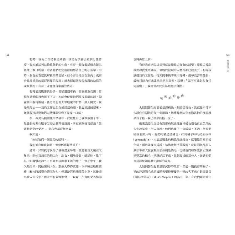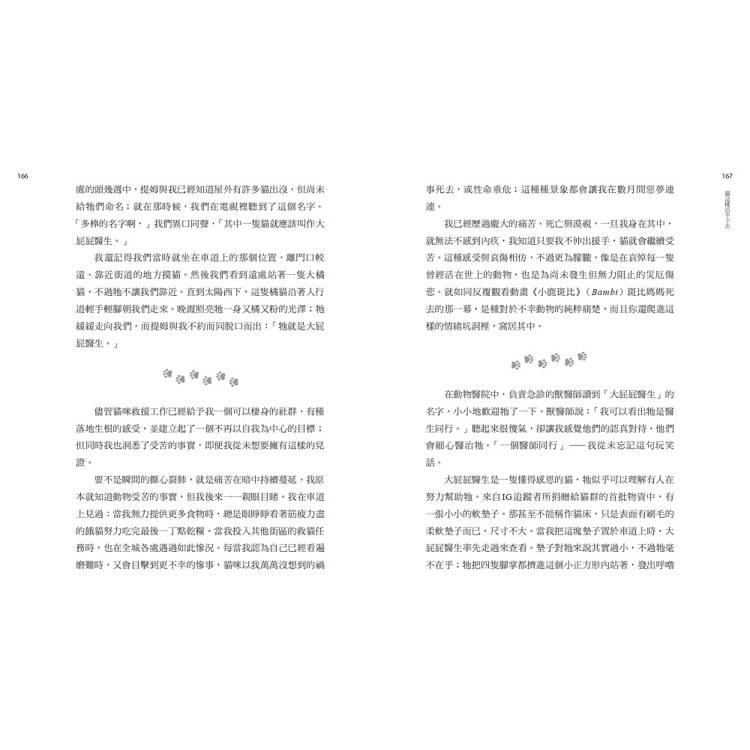 台灣與美國對於貓咪救援的做法不盡相同,但愛護動物的心都是一致的。這本書沒有要你從此投入動物保育,也不是在呼籲付出行動,只是希望你能夠從中看到關懷他者生命的溫柔,以及面對自我的誠實。