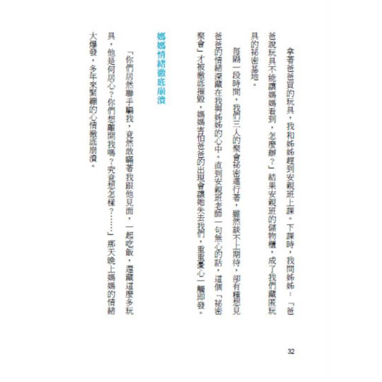 雖然家裡並不窮,但人口眾多必須節儉,因此念書期間我們沒有零用錢可用來買課外讀物。幸好巷子對面一戶人家,在晚飯過後的七點到九點,總是會聽某個「說書」電臺,內容都是民間故事,《三國演義》、《封神榜》、《孫臏下山》、《水滸傳》等。哥哥和我都很想聽,可是爸爸不准我們轉電臺,於是我向對面人家請求轉大聲點,我可以站在店門口邊顧店邊偷聽,有時候不知不覺腳步越過了巷子中線,父親發現,叫著:「顧店顧到馬路去了嗎?」我只好挪回到店門口。無論如何,那是我一天中最快樂的時刻!