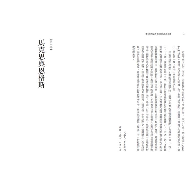 本書收錄霍氏從1956到2009年來撰寫的共十六篇論文,內容主要回顧馬克思思想的發展及其身後的影響及思想流變,並試圖釐清許多關於馬克思、恩格斯思想的爭議:人類歷史必然是單一線性地前進嗎?在通往共產社會的路途上,資本主義是必經的階段嗎?國家在階級鬥爭中扮演什麼角色?重讀《共產黨宣言》是否可以幫助我們預言今天的資本主義即將覆亡?對任何關心資本主義與人類未來命運的讀者來說,這是一本不可或缺的深刻歷史分析。
