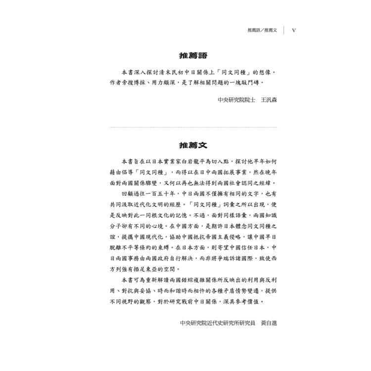 ◆本書深入探討清末民初中日關係上「同文同種」的想像。作者旁搜博採、用力頗深,是了解相關問題的一塊敲門磚。