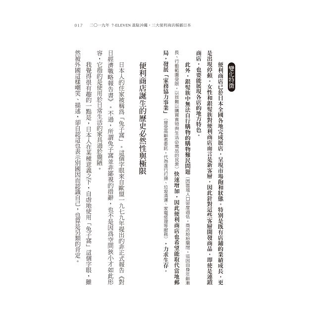 變化特徵 便利商店誕生的歷史必然性與極限/便利商店終於達到飽和了嗎?/單身戶數的增加與便利商店的關係/便利商店提出的對策/便利商店與購物弱勢者問題/從POS系統的影響到家務協力 賺錢方式 便利商店成為新型家務協力,一心追求便利性