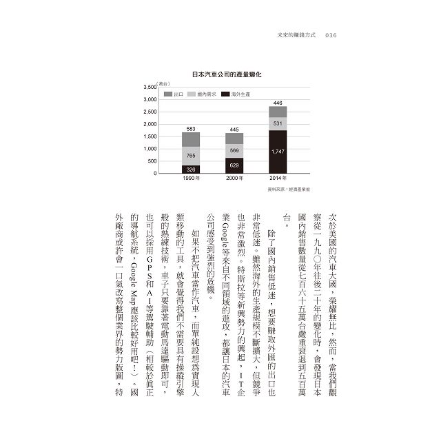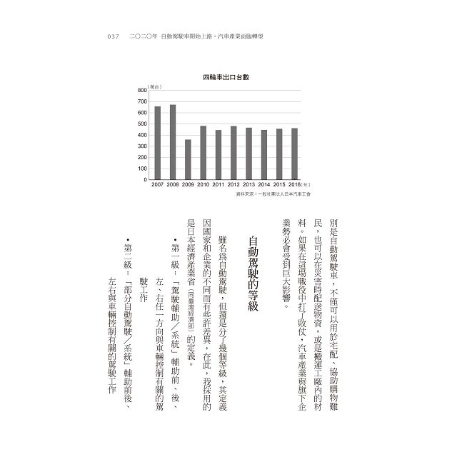 變化特徵 汽車的誕生與發展巔峰/日本汽車業界的焦慮/自動駕駛的等級/移動服務的時代/汽車產業邁向全球性飽和/各家汽車公司的策略/駕駛樂趣可以被捨棄嗎?賺錢方式 自動駕駛上路後,汽車將變成會移動的金融商品