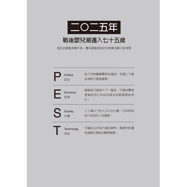 變化特徵 再會了,青春歲月/人口的變化/身為消費者的銀髮族/現代銀髮族的年輕活力/銀髮族行銷會持續到永遠/各式各樣的嘗試:① 店鋪設計的變化/各式各樣的嘗試:② 興趣、戀愛、旅行/各式各樣的嘗試:③ 家務協力服務/銀髮族是新興消費客層 賺錢方式 高齡化的戀愛市場