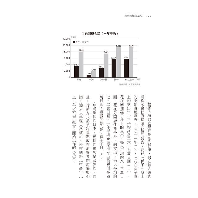 若從「消費族群」來區分,你可以了解銀髮族、年輕世代、女性族群各自需要什麼服務和商品需求。譬如,以銀髮族為例,最重要的關鍵點是去思考,如何讓銀髮族不會意識到自己是銀髮族。讓銀髮族追求幸福,開拓像高齡戀愛市場、交流服務、興趣活動、旅遊規畫的生意。還有,我們常聽到以「肉食女」來描述某種戀愛模式,不過,作者從數據中看出,在日本購買正確最多牛肉的正是女性銀髮族。是什麼動機讓這些「肉食高齡女子」去購買牛肉?
