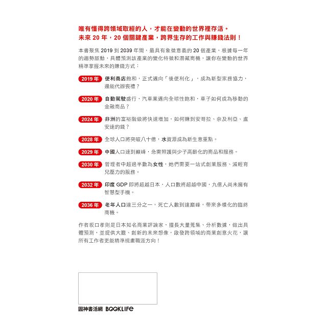 本書聚焦2019到2039年間,最具有象徵意義的20個產業,根據每一年的趨勢脈動,具體預測該產業的變化特徵和潛藏商機,讓你在變動的世界精準掌握未來的賺錢方式: