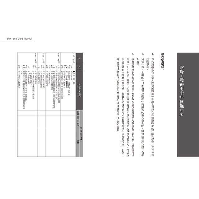 本書在附錄「戰後七十年回顧年表」中,特別設計了一個「個人歷史記錄欄」,希望讀者也能把自己的戰後史記錄下來。如果將個人的生活和工作經歷,與表格前一欄中的世界和日本大事加以對照,一定可以讓各位讀者更清晰地想起當時的回憶。