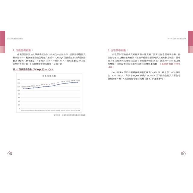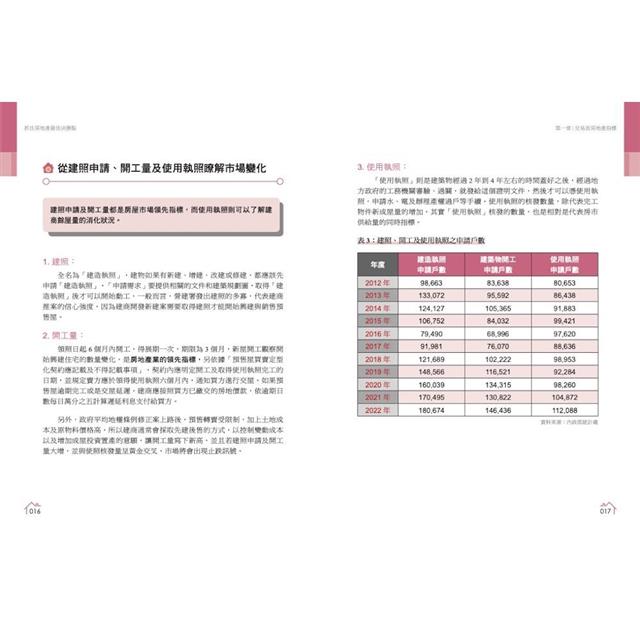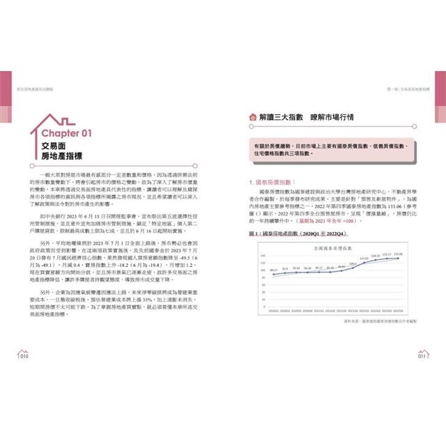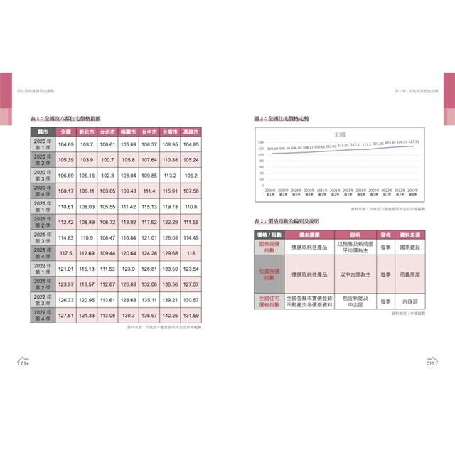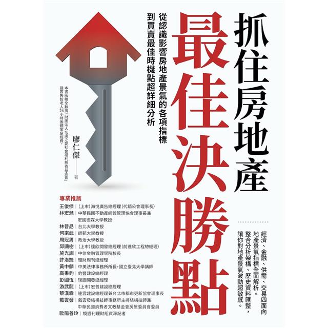 (2)    本書不動產指標及金融指標彼此相關,指標觀念除皆貫穿全書外,另書中在房市交易、供需、金融、經濟等面向,皆能提供不動產綜合的判讀及投資。