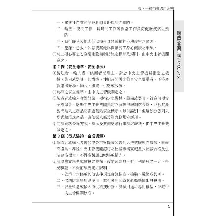 另本書亦涵蓋了職業安全衛生業務主管、職業安全衛生管理員(師)、有害(營造、高壓)作業主管等相關法規內容,亦可使用於教學與考試準備。