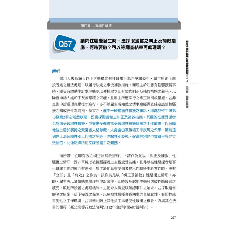 Q57.請問性騷擾發生時,應採取適當之糾正及補救措施,何時要做?可以等調查結束再處理嗎?