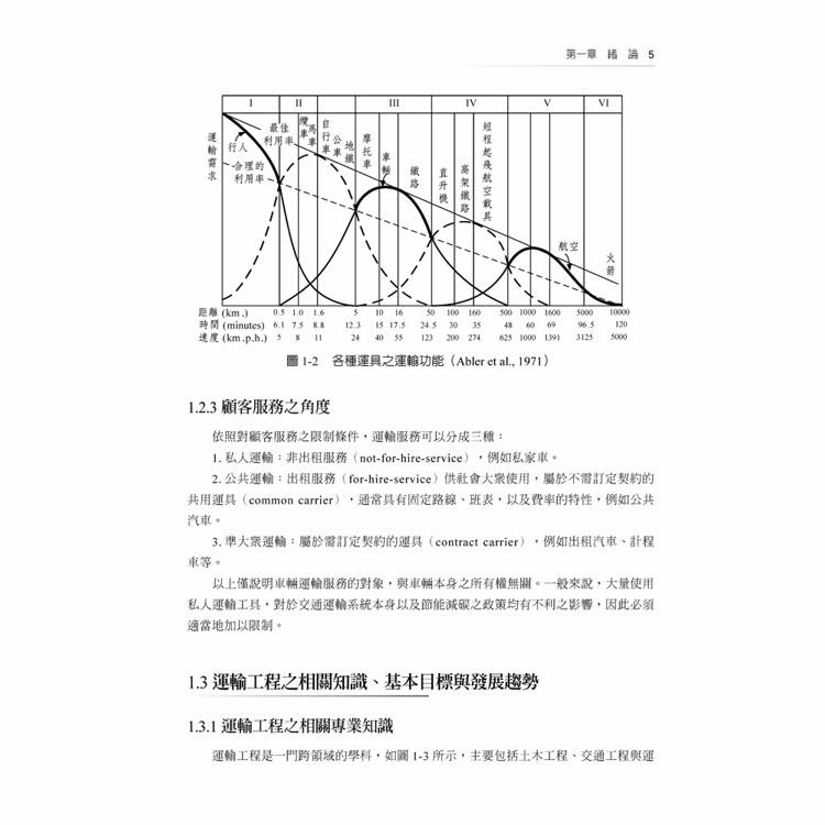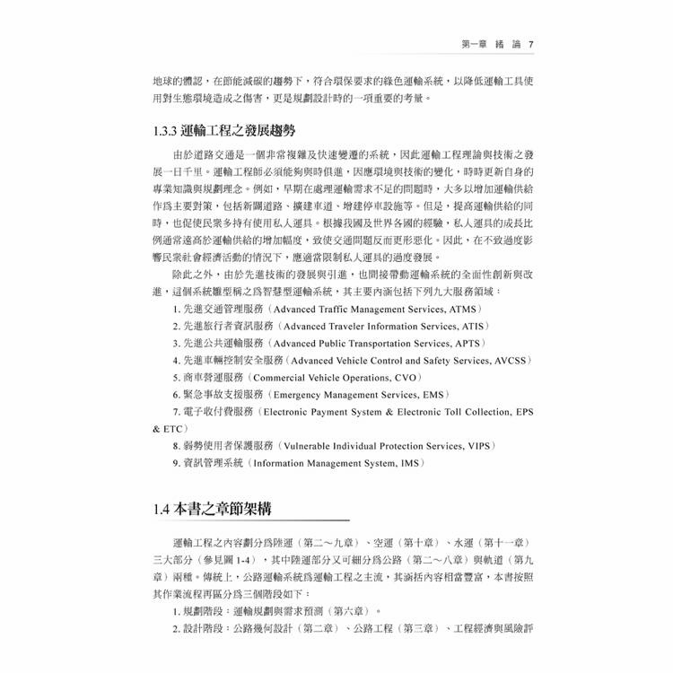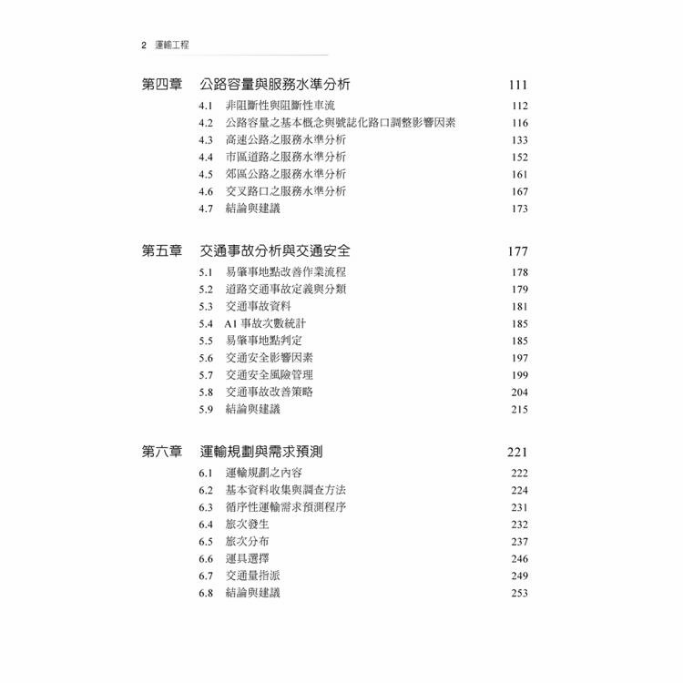 ‧基本與進階知識:以傳統運輸工程的專業知識為主要內容,涵括公路幾何設計、公路工程、公路容量與服務水準分析、交通事故分析與交通安全、運輸規劃與需求預測、工程經濟分析、智慧型運輸系統、軌道運輸、航空運輸,以及水道運輸。就大學部高年級的同學而言,可參考第一至第八章之內容,以奠定基本知識之基礎,至於研究所的同學則可增加閱讀第九章至十一章之內容,以全面性的了解運輸工程的內涵。