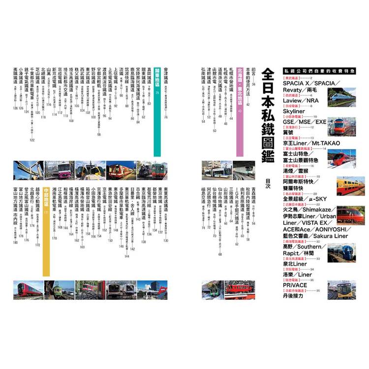 此外,關於本書標題的「私鐵」,正確來說應該是「民鐵與交通局與第三部門鐵道」。JR民營化後也是民鐵,但本書是《搭乘列車吧!JR全路線圖鑑》的姊妹作,所以使用一般用語「私鐵」來指稱JR以外的鐵道。