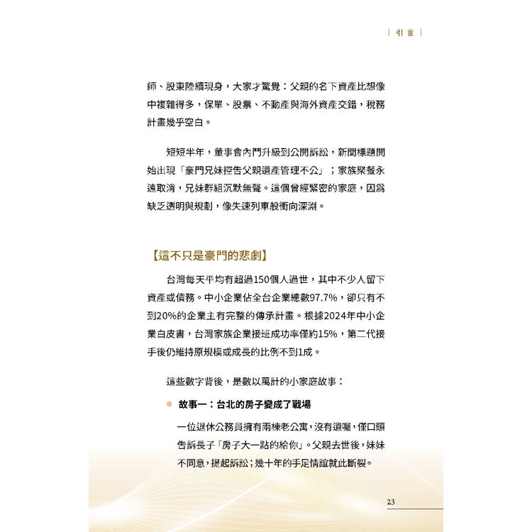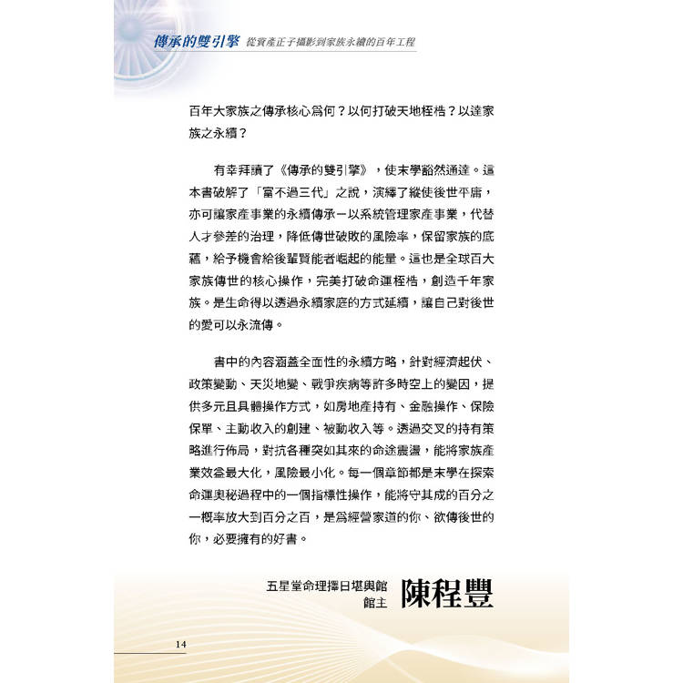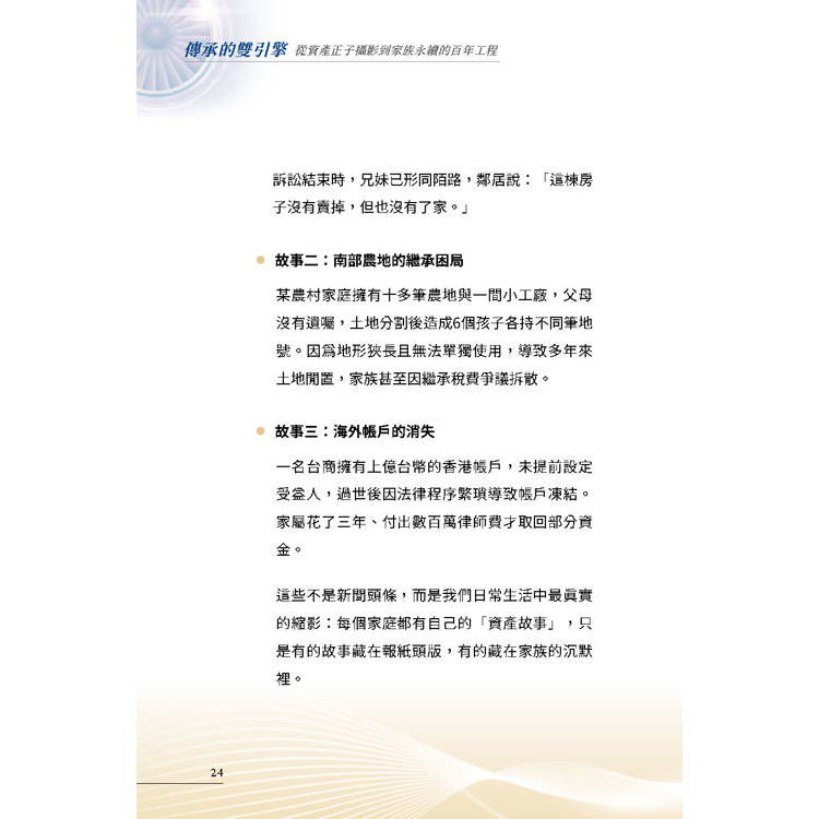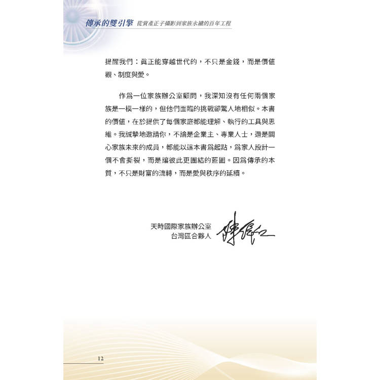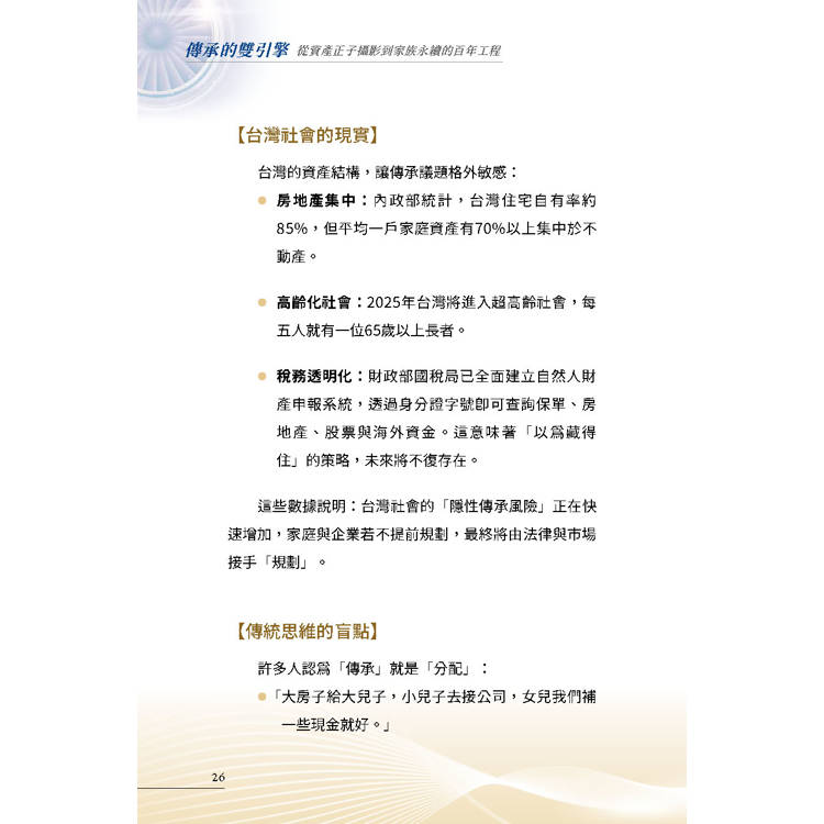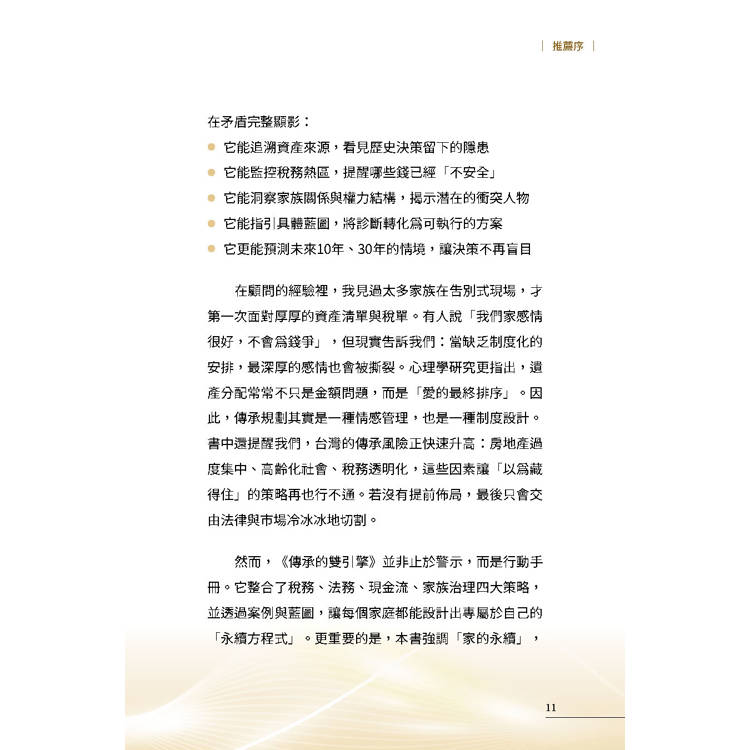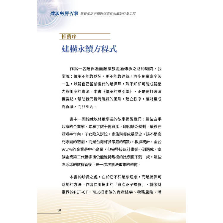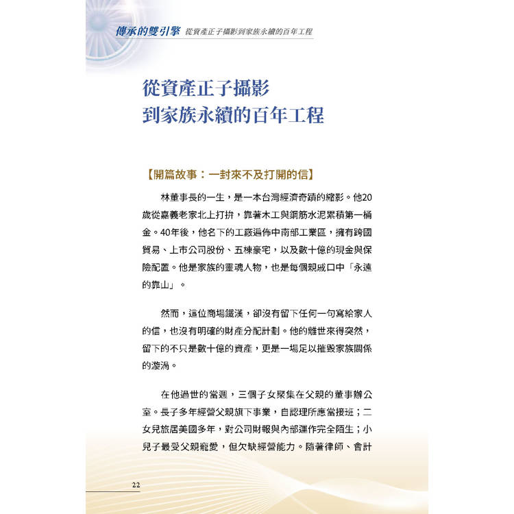 如果說,企業家的智慧與自傳是家族的「靈魂」;那麼,這本書提供的「資產正子攝影」,就是守護這個靈魂的「永續系統」。