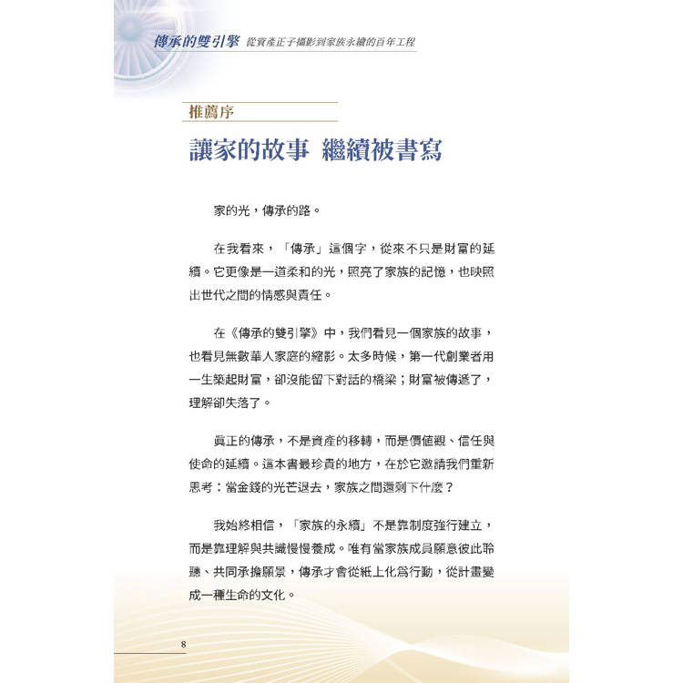 真正的傳承,不是資產的移轉,而是價值觀、信任與使命的延續。這本書最珍貴的地方,在於它邀請我們重新思考:當金錢的光芒退去,家族之間還剩下什麼?
