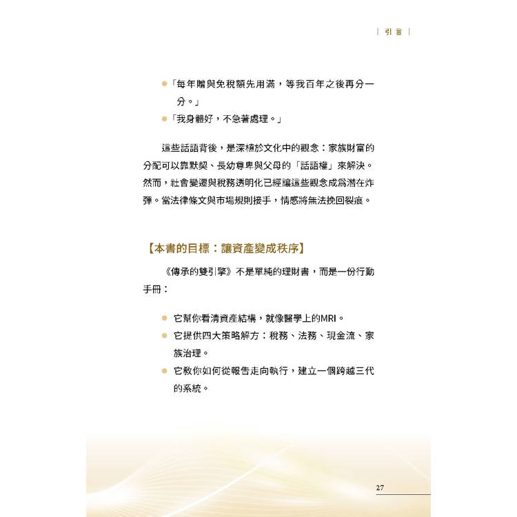 《傳承的雙引擎》不是單純的理財書,而是一份行動手冊: