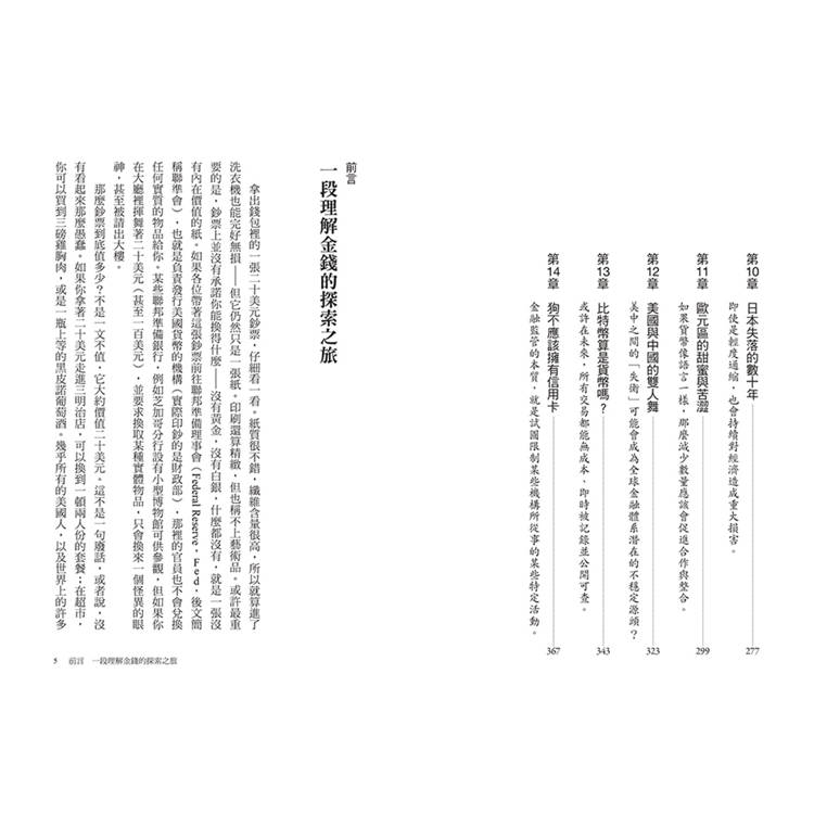 這是一本關於金錢的書,關於你口袋裡那幾張紙是如何得到這樣的價值,還有為什麼這種看似荒謬的行為——用看似毫無內在價值的紙去換取真正的商品——會是現代經濟的根本。而在這個過程中,我們也會探討另一個更奇怪的現象:你可以開一張支票、按一按手機,或者遞出一張長方形的塑膠卡,就能帶走一組家具、一些辦公用品,甚至是一輛車。