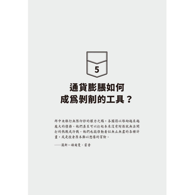 作者引用諾貝爾經濟學獎得主海耶克等知名經濟學家的研究,說明貨幣壟斷權對消費者的損害,以及人們為何無法察覺體制問題。透過這些分析,讀者可以客觀理解國家擴張貨幣供應、不斷舉債、剝削弱勢階層稅收,以及富人減稅政策等現象,進而理解貨幣體系如何一步步朝向有利於富人的方向發展。在景氣循環不斷起伏的當下,這是一本看清被濫用的貨幣制度如何在無聲中掏空我們的財富,並尋求經濟不平等解方的必讀之作。