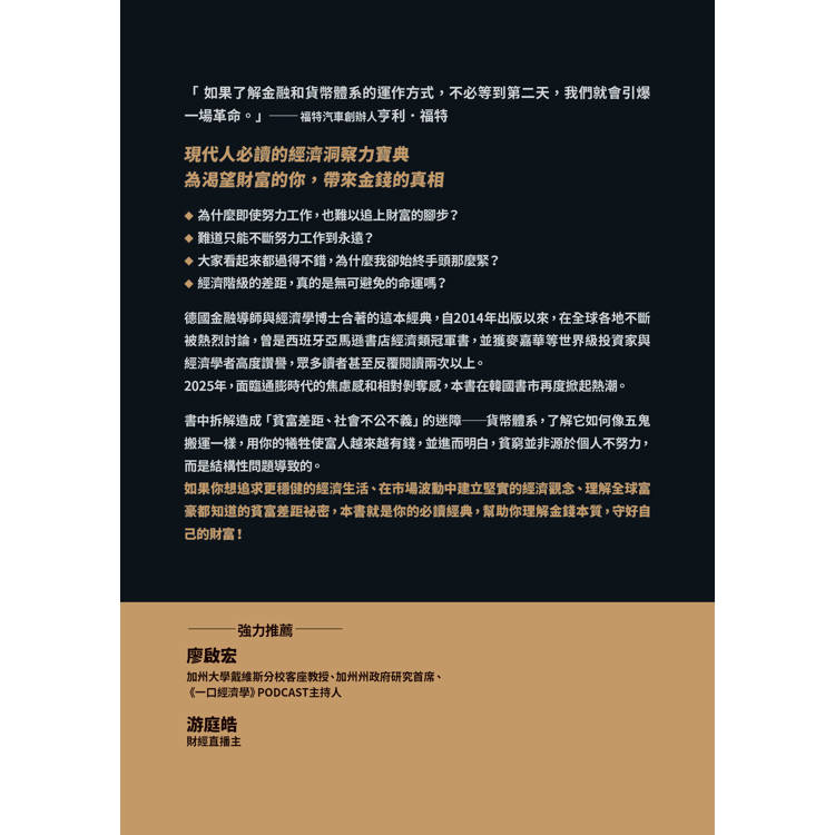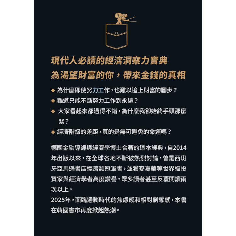 如果你想追求更穩健的經濟生活、在市場波動中建立堅實的經濟觀念、理解全球富豪都知道的貧富差距祕密,本書就是你的必讀經典,幫助你理解金錢本質,守好自己的財富!