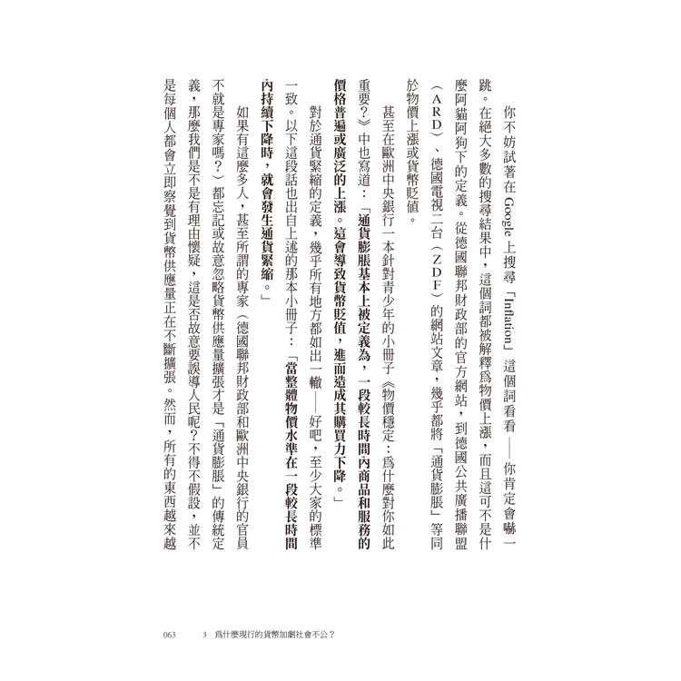 馬夸特與巴格斯這兩位德國經濟學者,在書中從貨幣的起源談起,用生動的例子與辯證方式批判主流總體經濟學,提醒我們:現代貨幣體系下的通膨、福利與貨幣供給,其實多半受政府、央行與銀行財團操縱。兩位學者宛如經濟學中的「莫斐斯」,意在喚醒我們這些「尼歐」,看清貨幣制度如何在無聲中掏空我們的財富。