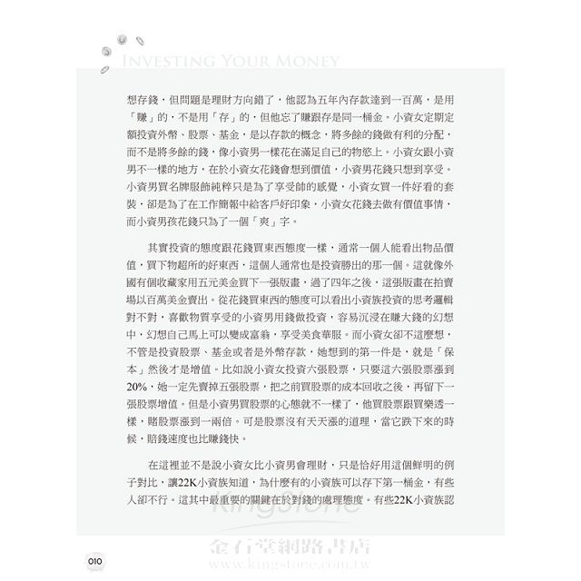 在這裡並不是說小資女比小資男會理財,只是恰好用這個鮮明的例子對比,讓22K小資族知道,為什麼有的小資族可以存下第一桶金,有些卻不行。這其中最 重要的關鍵在於對錢的處理態度。有些22K小資族認為自己賺太少,存不到什麼錢,這種嫌錢「賺」太少的人,通常也會嫌錢「存」太少而沒有投資意願。以上的 故事告訴我們,只要用對方法,每月省下至少三分之一薪水,再把省下的錢做好投資理財規畫,你也可以從薪水族翻身成為黃金貴族。