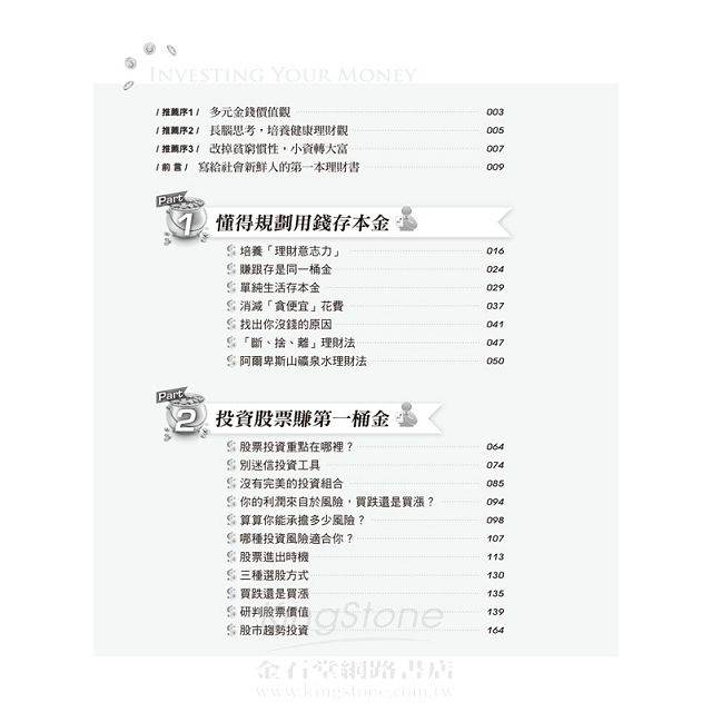 本書從如何規劃用錢,存「本金」開始說起,藉由用錢、存錢的方法,從理財應具備的觀念和態度開始,建構你的投資腦袋,之後再認識即將影響你一生的投資 工具,透過釐清自己的現狀,找出適合你的投資方式,讓年輕的小資族了解如何透過投資股票、基金、外幣聰明理薪,輕鬆存下第一桶金,讓死薪水變成活財富!