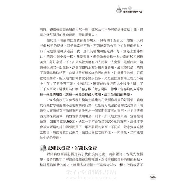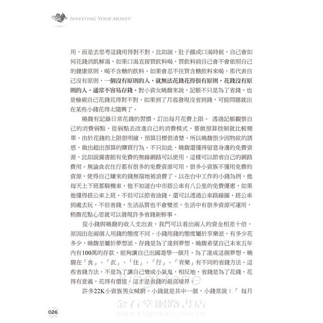 寫這本書的用意,並不是要教小資族變成投資之神,畢竟成為神之前,必須先克服自己亂花錢的欲望,才有辦法變成神。從投資者變成投資之神的過程中,如何 正確運用金錢是最基礎課程。多數小資上班族沒先學會如何用錢、存錢就開始投資,這等於拿著刀槍上戰場跟機關槍打戰,別說是投資賺錢了,連保住本金都有問 題。本書想鼓勵那些哀嘆自己賺太少沒辦法存錢的22k小資族,其實存錢不難,投資也沒有想像中的遙遠,很多貧窮的產生,大都是沒有理財習慣所造成的。