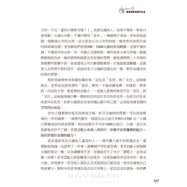 本書提供的觀念與操作立即就可啟動,不必等有錢,教你學會如何幫自己減薪,存財富,「財富規畫」要趁早!越早學會理財方法,你就離人生第一桶金越近!