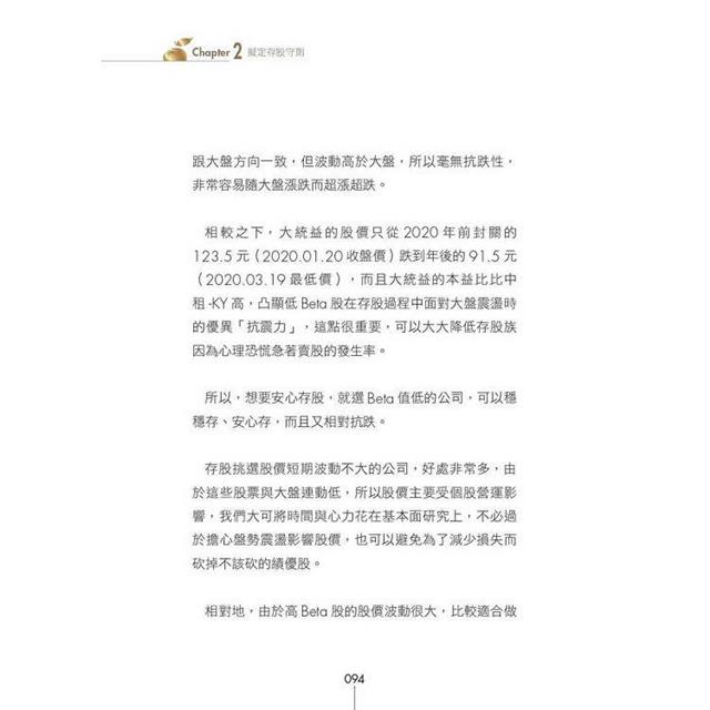 「連續5年報酬率都是5%」以及「連續4年賺10%,最後1年虧13%」,哪一個總報酬率比較好?乍看好像後者比較好,但如果用複利計算,其實前者的累積報酬率更好。這告訴我們,複利的連續成長性非常重要。因此,只有配置一組每年都能穩定獲利的公司組合,才有機會讓你的投資報酬率也持盈保泰。