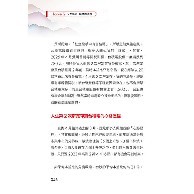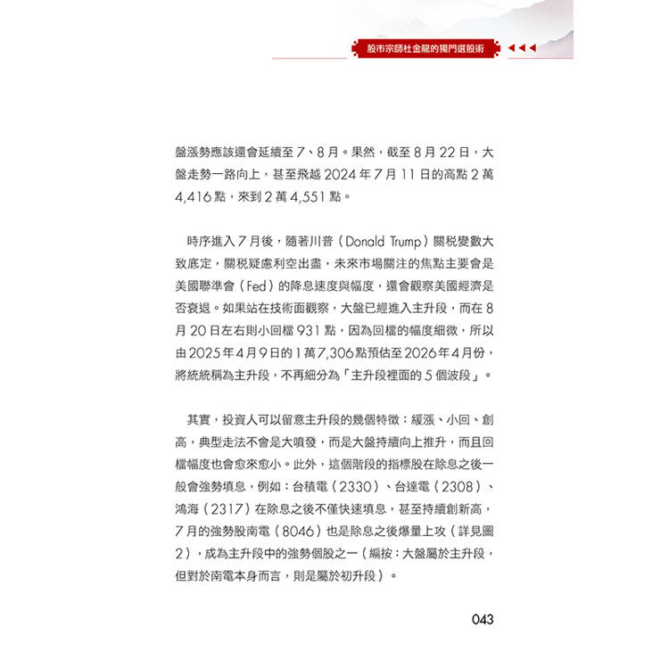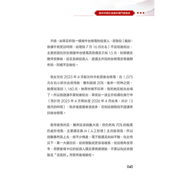 本書《股市宗師杜金龍的獨門選股術》,作者以豐富的市場經驗為基底,將宏觀趨勢與實戰操作交織在一起,帶領讀者重新認識台股的脈動。特別是為了幫助一般讀者更容易閱讀與學習,本書從台積電(2330)的波段操作談起,到分析美國對等關稅對台股的連鎖效應,他讓讀者看見,投資從來不只是數據的堆疊,更是對人性與週期的理解。