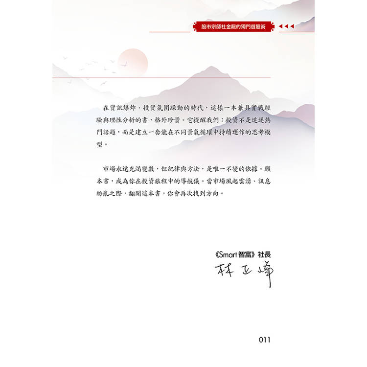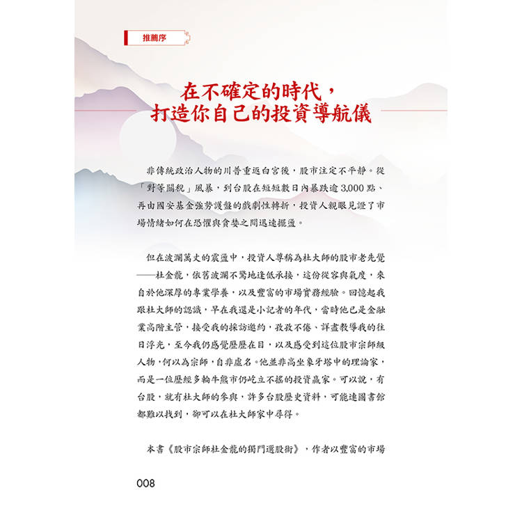 但在波瀾萬丈的震盪中,投資人尊稱為杜大師的股市老先覺──杜金龍,依舊波瀾不驚地逢低承接,這份從容與氣度,來自於他深厚的專業學養,以及豐富的市場實務經驗。回憶起我跟杜大師的認識,早在我還是小記者的年代,當時他已是金融業高階主管,接受我的採訪邀約,孜孜不倦、詳盡教導我的往日浮光,至今我仍感覺歷歷在目,以及感受到這位股市宗師級人物,何以為宗師,自非虛名。他並非高坐象牙塔中的理論家,而是一位歷經多輪牛熊市仍屹立不搖的投資贏家。可以說,有台股,就有杜大師的參與,許多台股歷史資料,可能連圖書館都難以找到,卻可以在杜大師家中尋得。